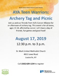 Join us and our friends from Norton Children’s Hospital for an afternoon of archery tag. This event is for all teens affected by cancer. To register call (502) 629-1234