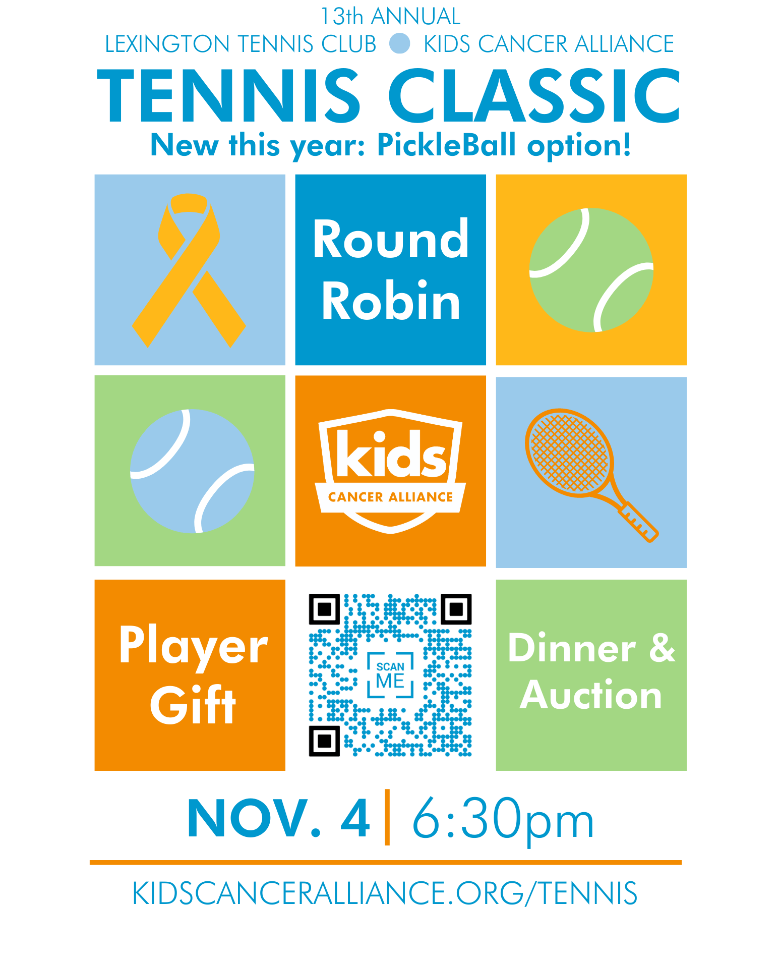 Tennis Classic will feature round robin style play, side games, and dinner. This event will also feature a large virtual presence with an online auction, raffle, and program. 100% of the proceeds will be donated to Kids Cancer Alliance for their programs for kids with cancer and their families.